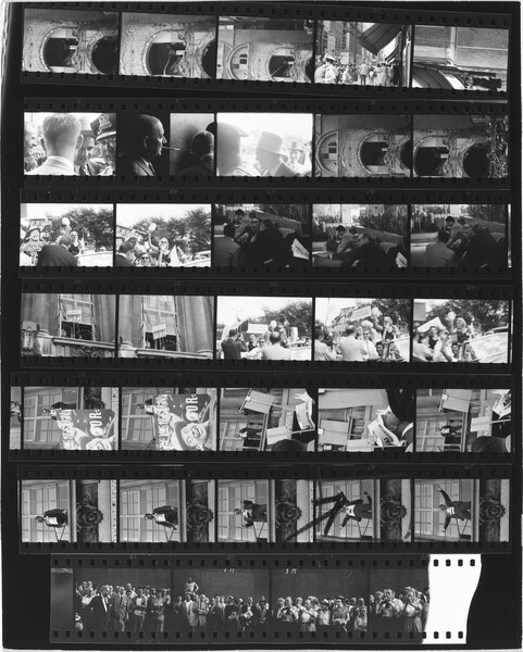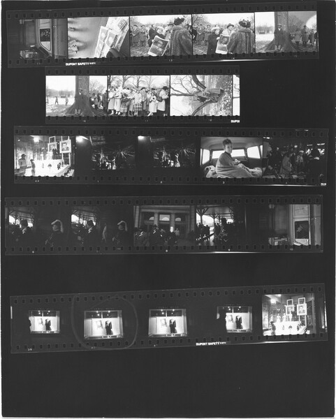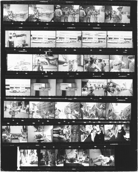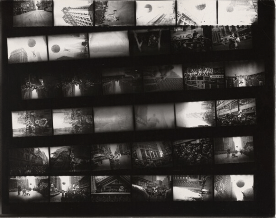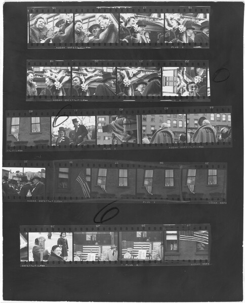 El 27 de noviembre de 1947, nueve meses después de su llegada a Nueva York, Robert Frank fotografió el vigésimo primer desfile del Día de Acción de Gracias frente a los almacenes Macy. Aunque había escuchado sobre el desfile por medio sus nuevos amigos, el fotógrafo nacido en Suiza apenas estaba aprendiendo sobre la ciudad y sus costumbres. Desde su juventud en Zúrich, siempre se había sentido atraído por las marchas y otras manifestaciones públicas de orgullo cívico y nacional, viéndolas como símbolos reveladores del carácter y de las creencias de un pueblo. Sin embargo, la ciudad de Nueva York y este desfile en particular, eran muy diferentes por su escala y su ambición, una realidad que Robert Frank no había experimentado antes como fotógrafo. Los periódicos de la época estimaron que más de dos millones de personas se reunieron en las calles ese día. Algunas aprecian apiñadas en los balcones, otras iban asomándose desde los tejados mientras el desfile bajaba por el Central Park West pasando luego por Broadway, antes de detenerse en los grandes almacenes Macy’s en la Thirty-Fourth Street.