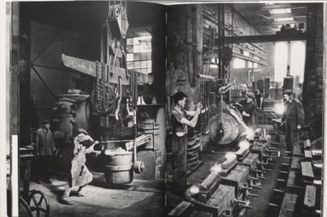 Otro libro, también publicado en 1943, fue de mucha mayor importancia para Frank: Fabrik de Tuggener: Ein Bildepos der Technik (Fábrica: una epopeya pictórica de la tecnología). Evocando la revisión ambiciosa de la relación entre el hombre y la industria, Fabrik expone una mirada dura sobre el poder destructivo de la tecnología a través de setenta y dos fotografías audaces e intransigentes impresas en un exuberante fotograbado. El libro está dividido en nueve partes, cada una de las cuales aborda diferentes aspectos de las industrias tradicionales y las tecnologías modernas, cada una separada por páginas en blanco destinadas a funcionar como «guiones», o pausas, que brindan a los espectadores la oportunidad de reflexionar sobre lo que han visto. La secuencia sofisticada de fotografías le debe mucho al propio cine de Jakob Tuggener, su estudio del cine modernista y su admiración por los principios de montaje de Sergei Eisenstein. Omitiendo los números y las leyendas de las páginas, sangraba todas las fotografías en los bordes de las páginas y combinaba con frecuencia dos imágenes de temas similares, dos trabajadores de dos fábricas en una página extendida. Pero reconoció, como escribió Eisenstein, que «dos películas de una especie, juntas, inevitablemente se combinan en un nuevo concepto, una nueva calidad, e intercalan estos pares de sujetos similares con fotografías que causan cambios bruscos de humor y de significado.”