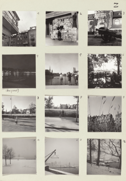 Además, Wolgensinger le enseñó a Frank una lección mucho más práctica, pero íntimamente importante: le mostró cómo hacer impresiones de hojas de contacto a partir de sus negativos de 2 ¼ de pulgada y pegarlos en tarjetas, reuniéndolos por tema. Utilizando este método de organización empleado por Wolgensinger y muchos otros fotógrafos europeos de la época, Frank hizo tarjetas con hojas de contacto de sus fotografías de animales, arquitectura, niños, granjas y personas (con la etiqueta «M» para Mensch). También los agrupó por temas más amplios, como reportaje, deportes, transporte, trabajo y la propia ciudad de Zúrich. La disciplina fue buena, ya que obligó al joven fotógrafo a adoptar hábitos de trabajo pragmáticos y ordenar su trabajo sistemáticamente. Pero la práctica fue mucho más importante, ya que le proporcionó a Frank un formato simple pero ideal para evaluar la importancia relativa de cada nueva fotografía, mientras le revelaba cuáles eran los temas que justificaban una mayor exploración y cuáles habían resultado menos exitosos. Sin embargo, lo más importante fue que lo alentó a pensar en su trabajo conceptualmente, no solo para clasificar sus fotografías, sino también para reconocer aquellos temas y temas que tenían significado para él.