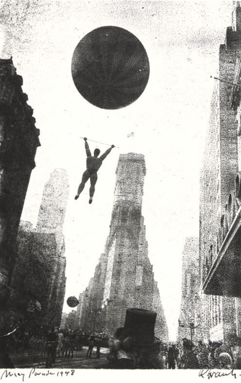 La atención de Frank y de todas las personas que lo rodeaban, pronto se dirigió hacia el cielo, donde flotaban enormes globos de helio que llenaban las densas calles de Nueva York. Un gesto en particular llamó la atención del fotógrafo: era la imagen de un hombre fuerte, con músculos abultados y brazos alzados triunfalmente, balanceándose desde un trapecio debajo de un globo aún más grande. Mientras el sol se filtraba entre los rascacielos, los cables que sujetaban el hombre al globo e incluso el propio trapecio, apenas eran visibles. No se podía saber si el hombre fuerte, estaba sosteniendo el mundo o si estaba a punto de caer en picada a la calle de abajo. Su misteriosa hazaña de fuerza y voluntad sorprendía a la multitud.
