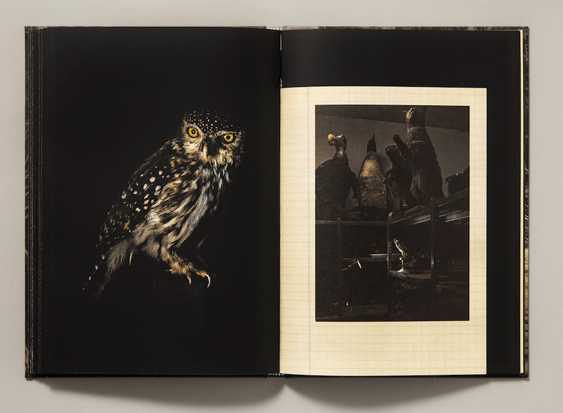 L.L.: Los dos primeros capítulos del libro, que no aparecen de forma lineal, sino visual, exploran al máximo la duda sobre si estos animales están vivos o no. Solos o en sus hábitats, los ojos menos atentos pueden pensar que es un libro sobre aves. El tercer capítulo aparece como un cuaderno científico, una recopilación de estudios que de alguna manera revelan el secreto del libro, es el contrapunto, la reflexión. Un detalle importante es que incluso en este cuaderno los animales aparecen de una manera que también podrían estar vivos, como si estuvieran visitando la propia taxidermia. Todo el diseño del libro habla íntegramente con la propuesta, las páginas que se abren como alas, las imágenes que se esconden y se revelan y el capítulo revelador que aparece en diferentes papeles y formatos. Todo ello reforzando la idea de trabajo fotográfico y potenciando el concepto de libro.