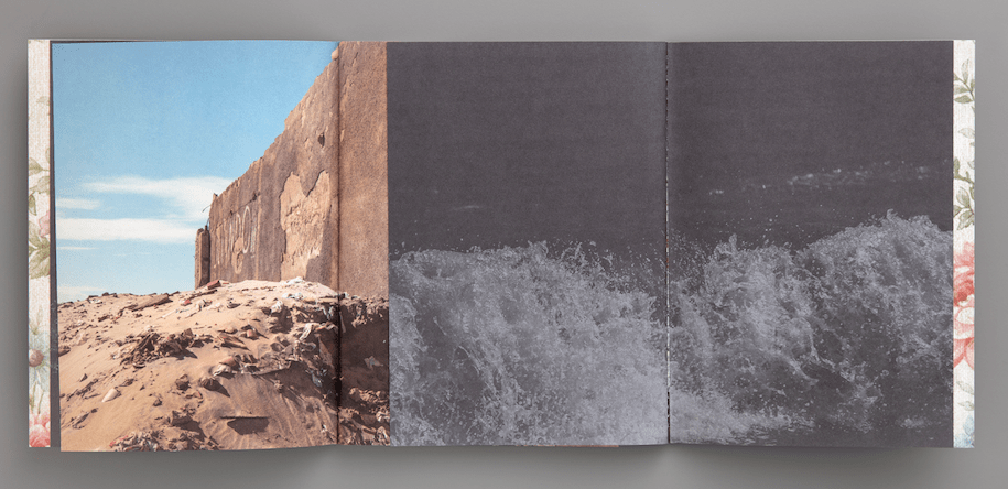 P.D.F.: El libro tiene un formato muy interesante porque se va abriendo página a página como si el lector tuviera dos libros entrelazados el uno con el otro. Entre los paisajes de agua y arena se va revelando la presencia de un paisaje que había sido habitado. Eso sólo lo revelan unos recuadros que asemejan los azulejos cuadrados de las casas, especialmente los que había sobre los pisos y los muros de baños y cocinas. ¿Qué papel tienen esos azulejos de flores en el relato y en las capas de imágenes que uno va despejando poco a poco mientras abre el libro?
