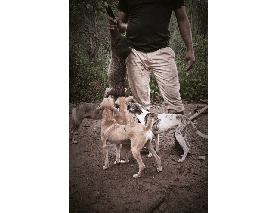 A Eduardito le preocupan las fotos, no quiere ser juzgado mientras sostiene un guatín recién cazado en su mano derecha. Lo cierto es que la cacería es una de las principales fuentes de proteína en el lugar. Eduardito nos mostró el árbol donde se sienta a esperar el paso del animal, algo parecido a los palos donde se trepan las gallinas. Espera horas y horas hasta que el ñeque o la pava, o el desafortunado animal comestible pase por el lugar. Ese talento lo ha convertido en la mano derecha de los biólogos visitantes que buscan un guía para rastrear a la especie que estén investigando.