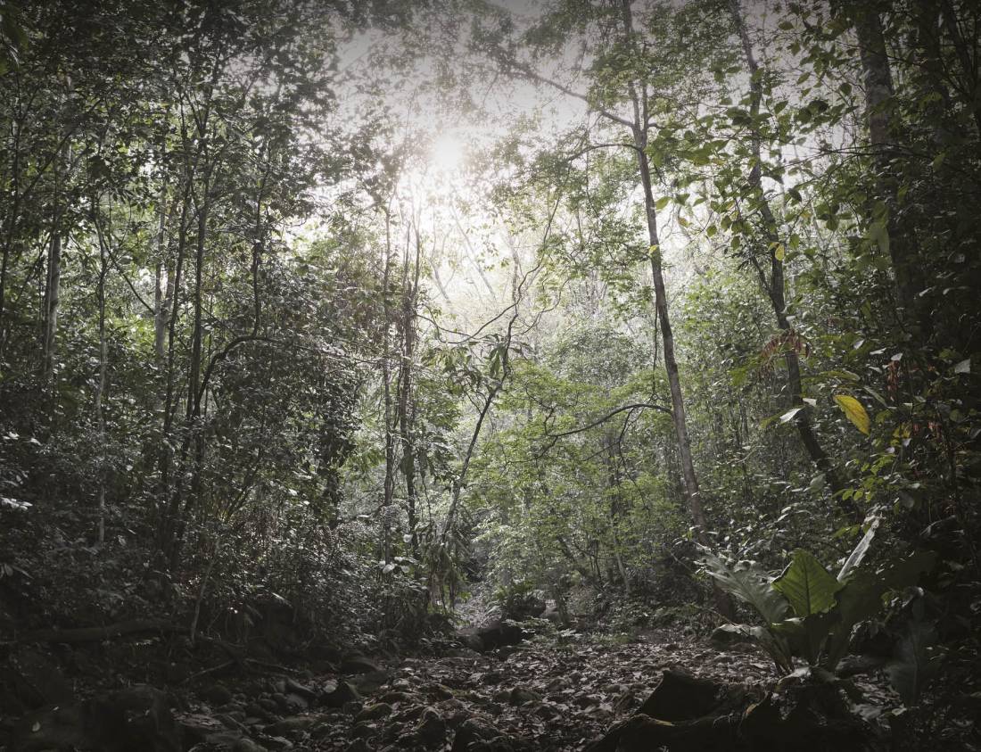 V.G.: Caminar por el bosque seco es recorrer una sinfonía de crujidos. Las hojas secas de las ceibas, los guayacanes, las palmas y los caracolís cubren los caminos y las faldas de las montañas, fertilizándolas. Caminamos por el hogar del Tití cabeciblanco, el mono aullador y la pava congona, de las babillas y un centenar de serpientes que se deslizan entre árboles gigantescos. En Colombia ha desaparecido el 92% de este ecosistema y del 8% restante sólo un 0,4% se encuentra protegido por el Estado.