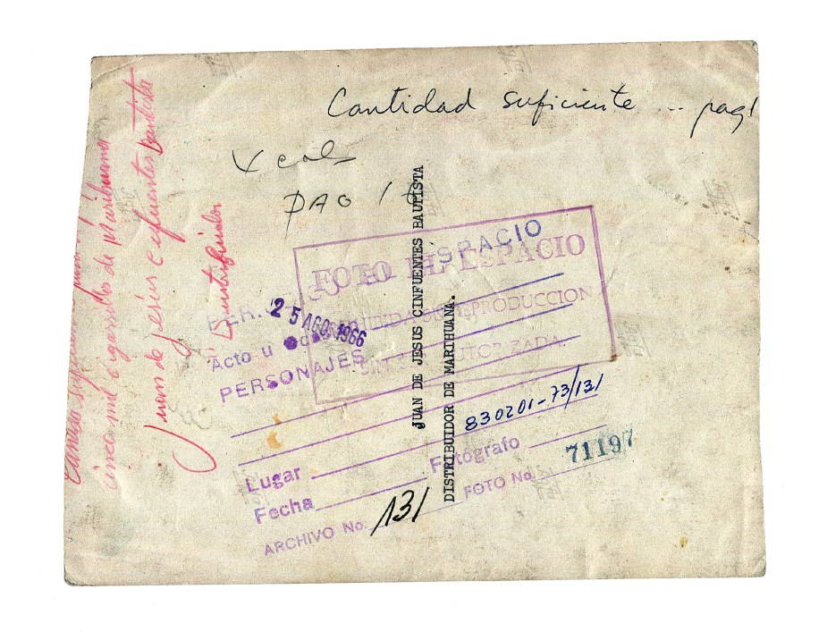 Fue un encuentro afortunado ya que al parecer todo el archivo había sido recientemente adquirido por el Archive of Modern Conflict, el vendedor había conservado algunas copias para sí mismo, y pude ver su selección, luego de una amable conversación, me regalo una de esas fotografías. Un traficante de marihuana en los años 60, expuesto frente a un tablero de escuela, fue mi primera fotografía. Y me acompaño en mi taller en México por unos meses hasta que surgió la invitación a participar con la galería con la que trabajaba en ese momento para ARTBO 2013, y decidí pensar una obra con dicha fotografía.