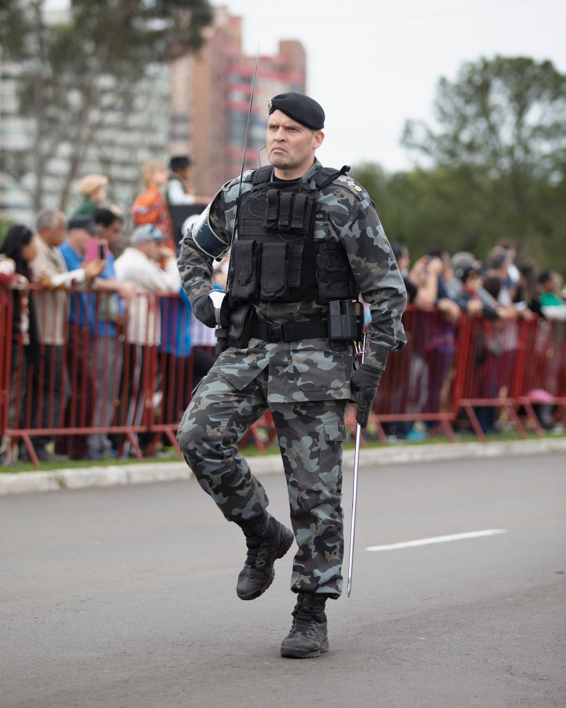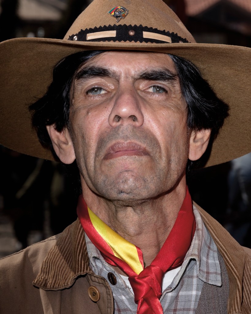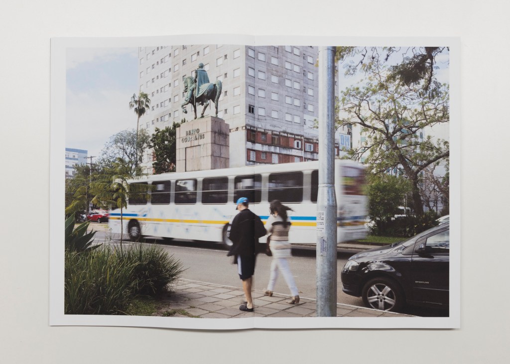 A.P.: Farroupilha está inspirado en la Revolución Farroupilha. Viajé durante dos años por Rio Grande do Sul en busca de imágenes que enlazaran el pasado con el presente y expusieran la complejidad de los desdoblamientos que este hecho histórico provocó. Al retomar temas como el Campamento Farroupilha, el desfile del 20 de septiembre, las lecturas teatrales y escenográficas de la Revolución y sus personajes, las fotografías dan otra capa de significado a monumentos y campos de batalla, como el legendario Porongos, donde tuvo lugar la llamada Masacre de los Lanceros Negros. La obra construye una secuencia de inventarios que, de vez en cuando, se «contaminan» con imágenes de unos y otros. La narración deambula por los lugares fotografiados construyendo una red de consecuencias que mezcla los homenajes con la realidad de la vida cotidiana.